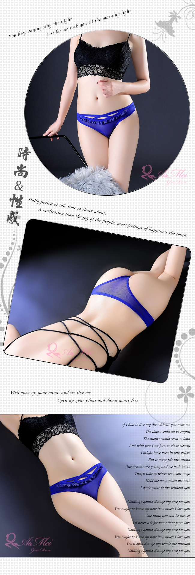 首頁>溫柔暗號!前交叉細帶滾邊蕾絲網紗中腰T字褲﹝寶藍﹞