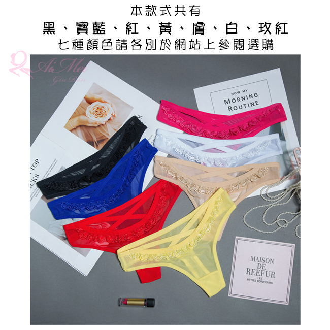 溫柔暗號!前交叉細帶滾邊蕾絲網紗中腰T字褲﹝寶藍﹞