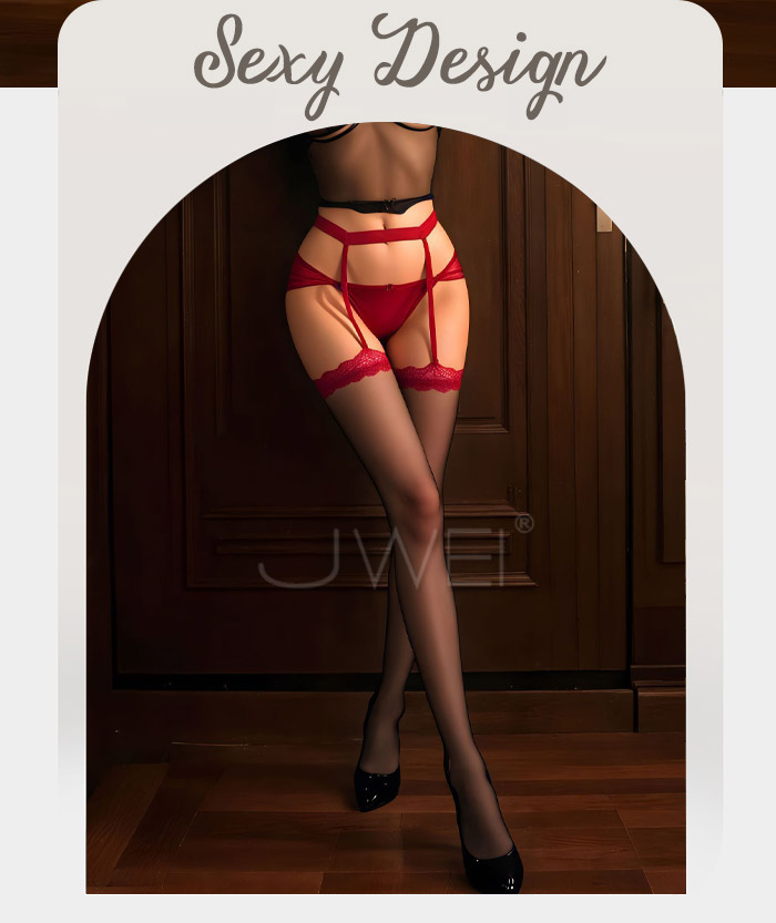 裸感啞光.唯美雕花一體式吊帶透膚啞光長筒絲襪【紅吊帶+黑絲襪】